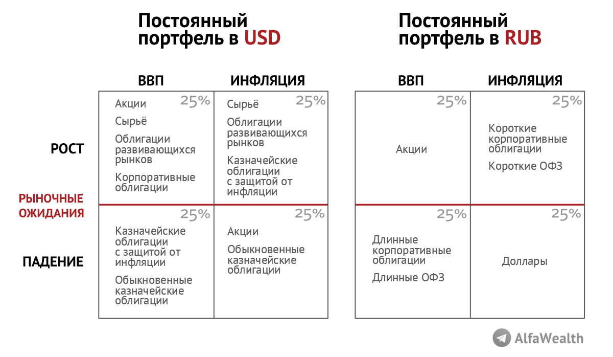 Идею Брауна подхватил Рэй Далио, основатель хэджфонда Bridgewater. Он разработал портфель All Weather Portfolio (таблица слева), который включает в себя все основные рыночные элементы: outperform одних компенсирует underperform других. Чтобы добиться идеальной комбинации, Далио разделил портфель на четыре равные части: