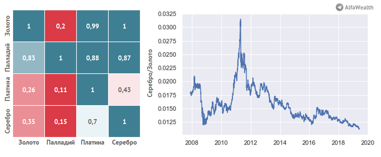 Чем меньше значение в ячейке матрицы, тем оно краснее и металл, соответственно, дешевле относительно другого. Например, возьмем ряд серебра. Увидим в ячейке значение 0,35, а значит серебро дешевле золота (это же отражено на графике соотношения цен золото/серебро с 2007 года). Серебро же дешевле палладия (значение 0,15). В итоге наиболее дешевыми по отношению к другим металлам остаются серебро и платина. Наиболее дорогими – золото и палладий.