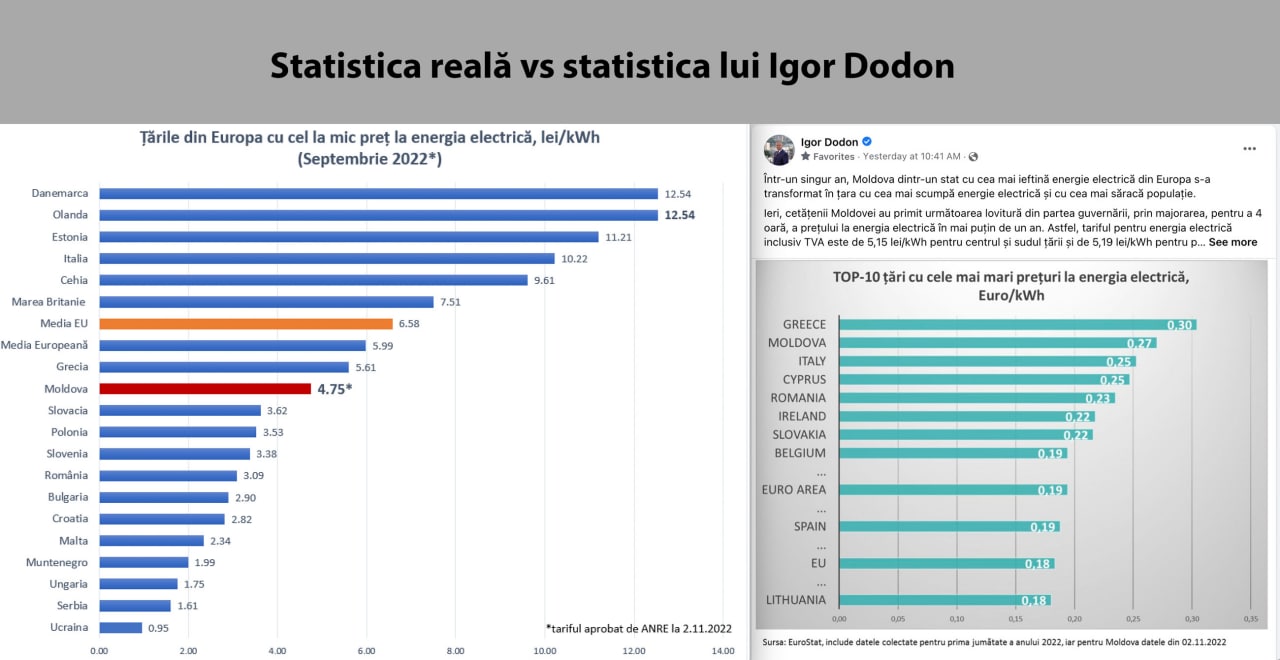 💡 Igor Dodon, dezinformat de subalterni?! În una dintre ultimele postări pe care le-au pregătit pentru liderul socialist, aceștia au publicat un grafic... mai aproape de fals decât de adevăr: Prețurile la electricitate în Europa, crescute din cauza războiului pornit de Rusia în Ucraina. Moldova nu se află în fruntea clasamentului în Europa, așa cum se arată, dar undeva la mijloc, potrivit datelor oficiale.