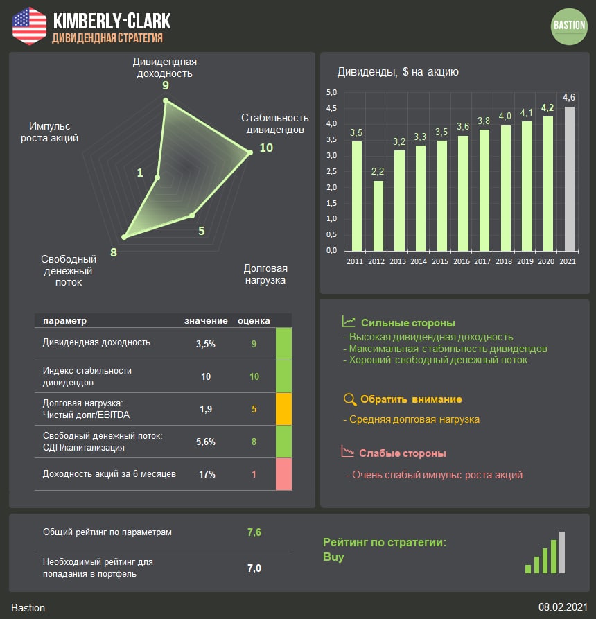 💼 Kimberly-Clark - классическая дивидендная компания в потребсекторе. Здесь нельзя найти рост будущей стоимости в 10 раз за 5 лет, зато риски потери доли рынка невелики. Хорошая дивидендная доходность, сильный свободный денежный поток и средняя долговая нагрузка формируют неплохой рейтинг по дивстратегии. Акция останется в портфеле.
