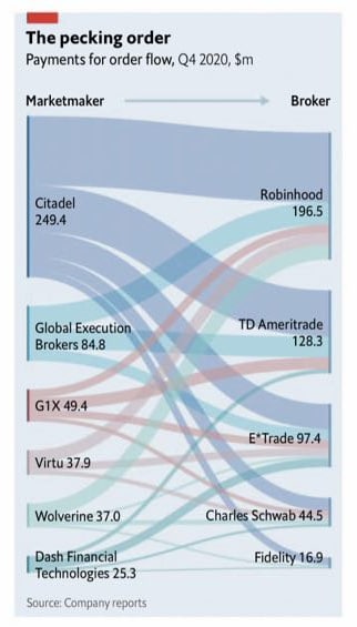 В 4 квартале брокер Robinhood заработал более $200 млн, продавая информацию о потоке сделок своих клиентов. Главный покупатель - хедж-фонд Citadel. Схема предполагает, что на каждой торговой сделке фонд зарабатывает небольшую прибыль, покупая акции у инвесторов чуть дешевле и одновременно продавая на рынке чуть дороже. Как развивалась такая высокочастотная торговля хорошо описано в книге Майкла Льюиса Flash Boys.