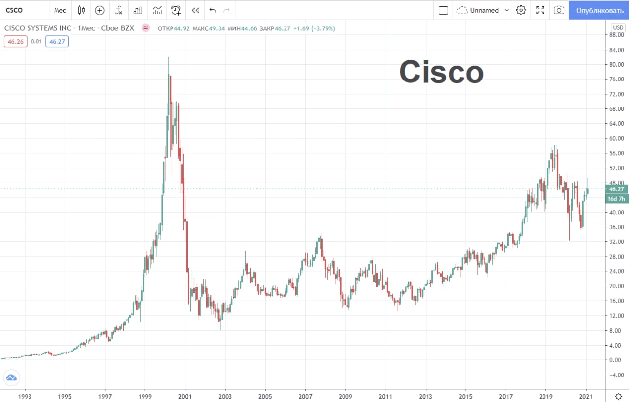 Акции Cisco так и не приблизились к тому историческому максимуму. Капитализация компании составляет чуть более $170 млрд, а акции торгуются с 18-кратным P/E.