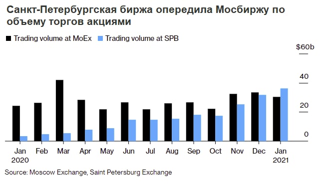 Bloomberg отмечает бум торгов иностранными акциями на Санкт-Петербургской бирже. Месячный оборот за год вырос в 11 раз до $36,1 млрд против $30,2 млрд на Мосбирже.