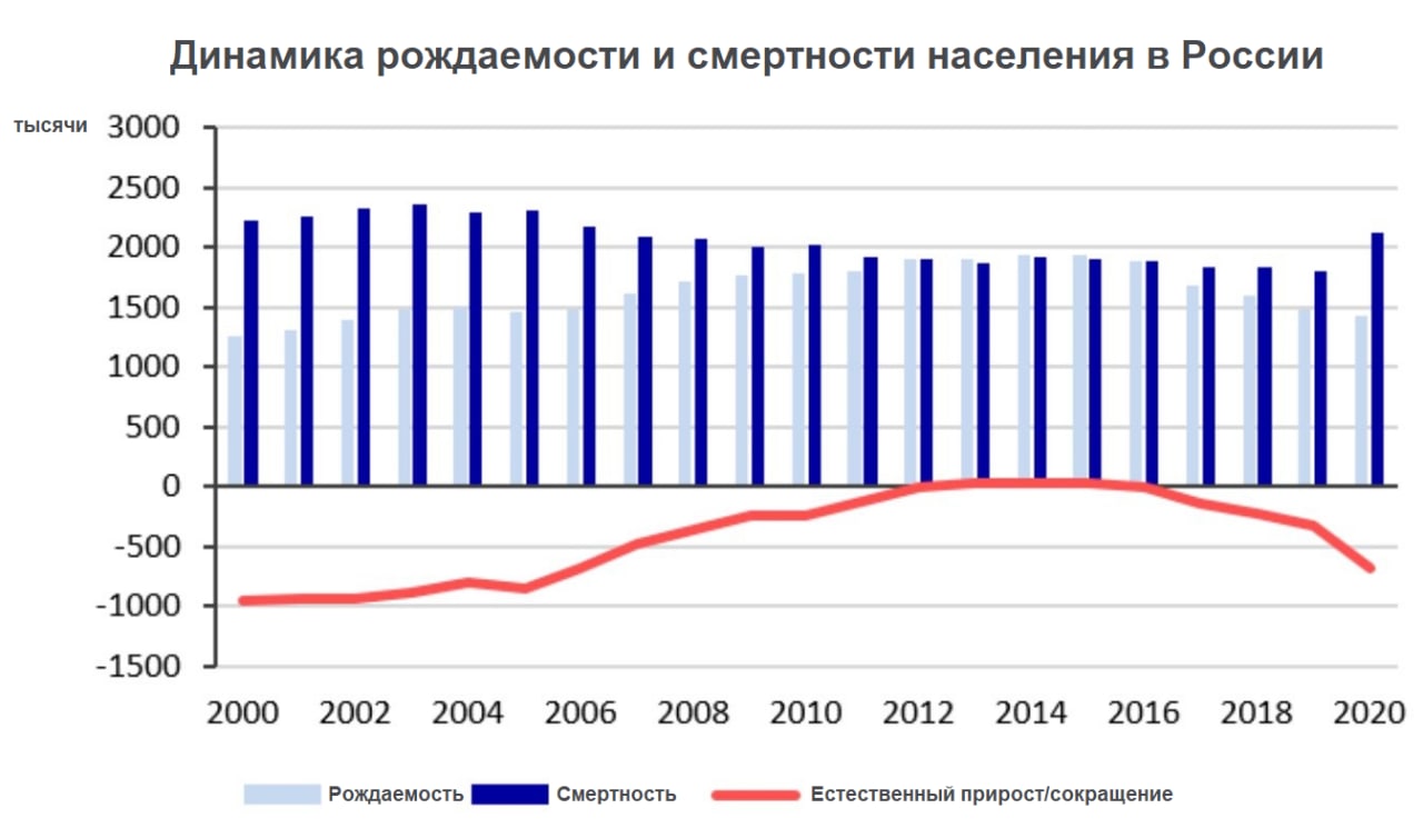 Число смертей превысило число рождений на 689 тысяч. На графике красная линия показывает, что это не только эффект пандемии, но и продолжение тренда на убыль, начавшегося в 2016 году.