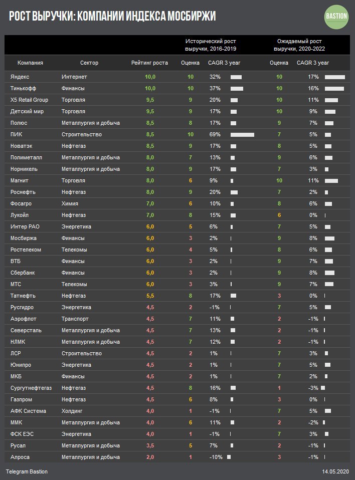 Тем не менее, мы должны включать фактор роста в оценку компаний. Для этого Bastion использует рейтинг на основе исторического и ожидаемого роста выручки компании за 3 года. Каждому из параметров присваивается значение от 1 до 10. Итоговая оценка - среднее по двум индикаторам.