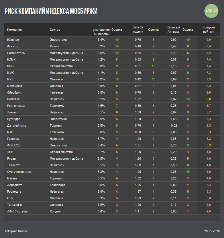 По каждому из параметров модель Bastion предполагает оценку от 1 до 10. Чем выше показатель, тем менее рискованными считаются акции. Общий рейтинг по критерию "риск" - среднее по 3 параметрам. Если 2 компании имеют схожие мультипликаторы оценки и перспективы роста, то в итоговый портфель попадет та, у которой рейтинг по критерию "риск" выше.