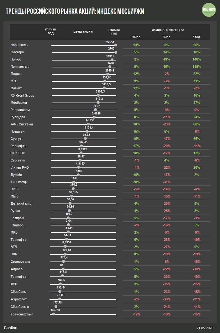 Таблица показывает, где находится текущая цена акции относительно минимума и максимума за год. Чем ближе ползунок вправо, тем выше текущий интерес к акции на рынке.