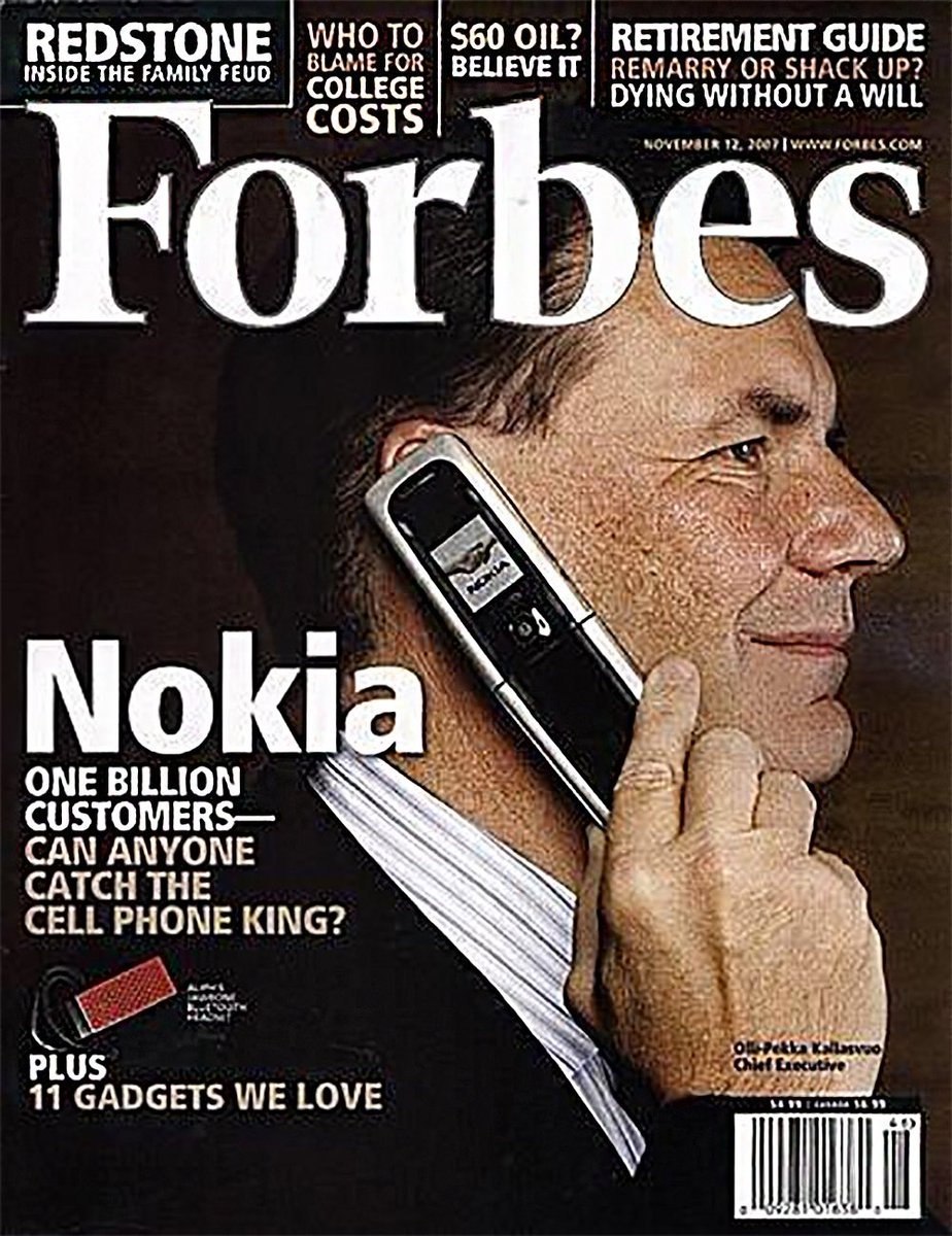 В год выхода этой обложки Forbes Стив Джобс презентует первый iPhone. Капитализация Nokia в течение 5 лет упадет со $150 млрд до $7 млрд. У Apple вырастет с $70 до $600 млрд. В конкурентной экономике сегодняшний лидер очень быстро может превратиться в аутсайдера.