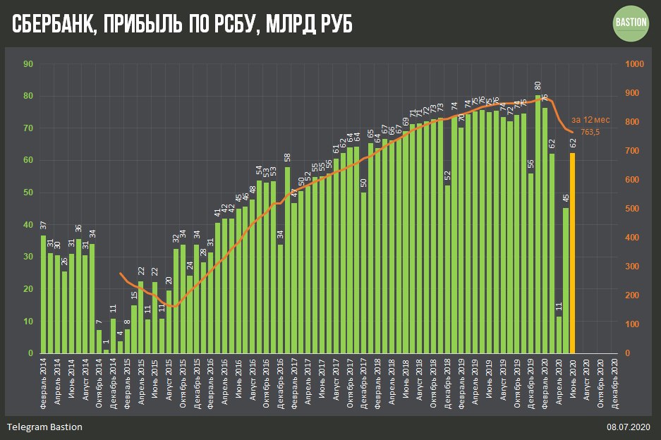 ▪️Сбербанк России в июне сократил чистую прибыль по РСБУ на 17% по сравнению с июнем 2019 года - до ₽62,3 млрд. Результат гораздо сильнее ожиданий. В мае падение прибыли достигало 40%, в апреле - 84%.