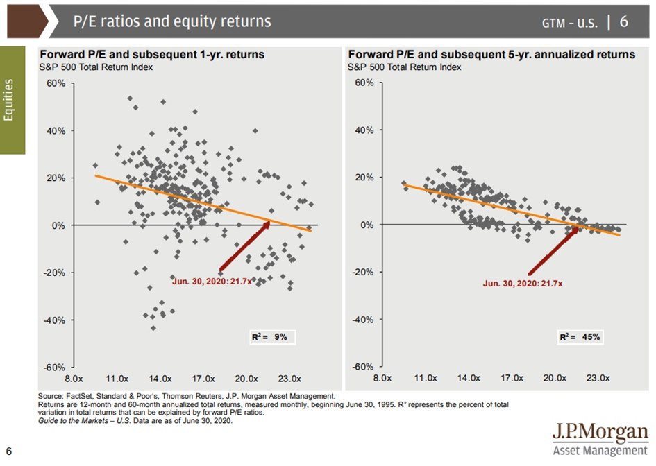 ▪️Исторически индикатор P/E плохо предсказывал доходность рынка акций в следующий год (левый график), но хорошо объяснял доходность в течение 5 лет (правый график). Уровень P/E в 21,7x предсказывает околонулевую доходность рынка акций в ближайшие 5 лет. Аргумент в пользу снижения доли акций в долгосрочном портфеле.