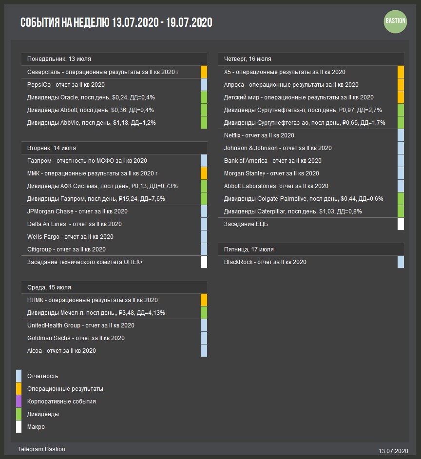 1) Отчеты американских банков. Крупнейшие американские банки на этой неделе опубликуют результаты, по которым можно будет оценить масштаб финансового кризиса в США. Особое внимание к Wells Fargo, который, скорее всего, объявит о сокращении дивидендов.