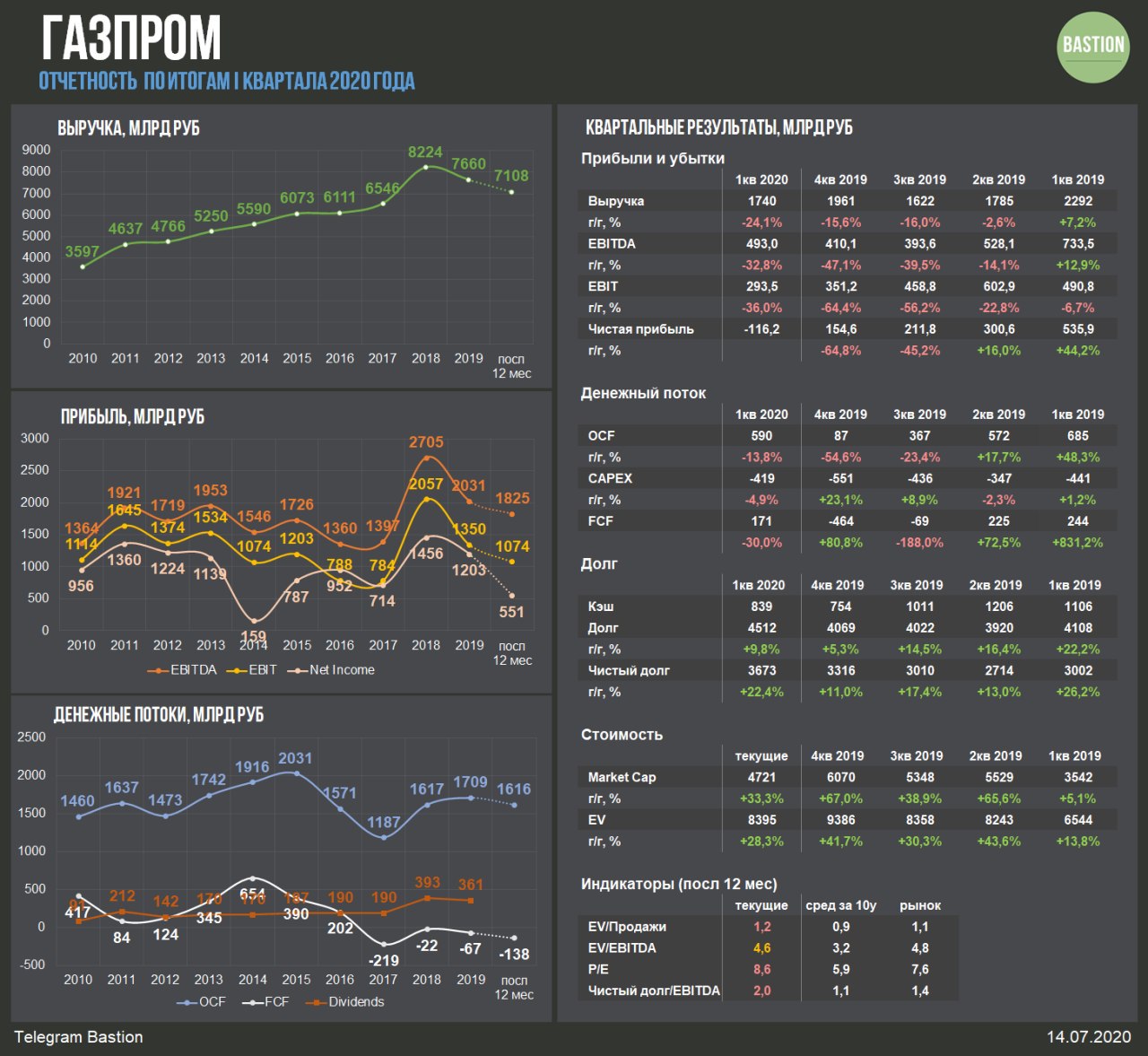 Газпром показал убыток в ₽116 млрд в I кв 2020, но менеджмент говорит, что для расчета дивидендов по итогам года будет использоваться скорректированный на "неденежные" статьи показатель прибыли в ₽228 млрд. Во II и III кв из-за дальнейшего падения цен на газ результат будет хуже.
