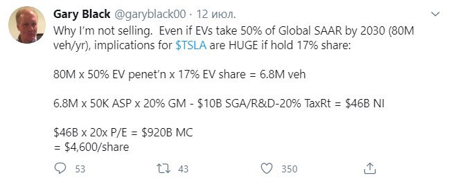 1. Не учтена ставка дисконтирования. Даже если предположить, что входящие данные модели верны, то $4600 это целевая цена в 2030 году. Она должна быть продисконтирована к текущему моменту времени. Если представить, что ставка дисконтирования 10% (а для Tesla это еще скромный подход), то текущая справедливая цена падает до $1770 за акцию.