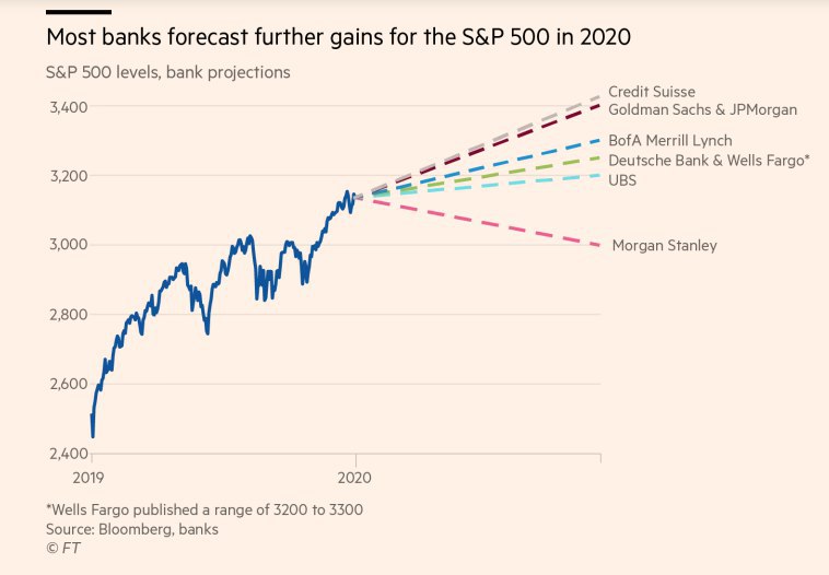 Настал декабрь, а значит время аналитикам почертить на графиках пунктирные палочки вправо. Прогноз крупнейших американских банков во индексу S&P500 на 2020 год попадает в традиционную воронку роста на 5-15%.