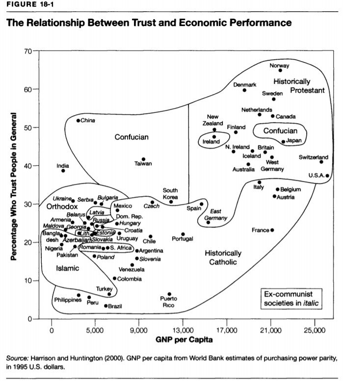 "Есть важная зависимость между доверием и экономическим успехом. Высокое доверие ведет к экономическому сотрудничеству, которое увеличивает богатство населения, которое еще больше увеличивает уровень доверия. Точно также страны могут двигаться в обратном направлении и оставаться в стабильной бедности.