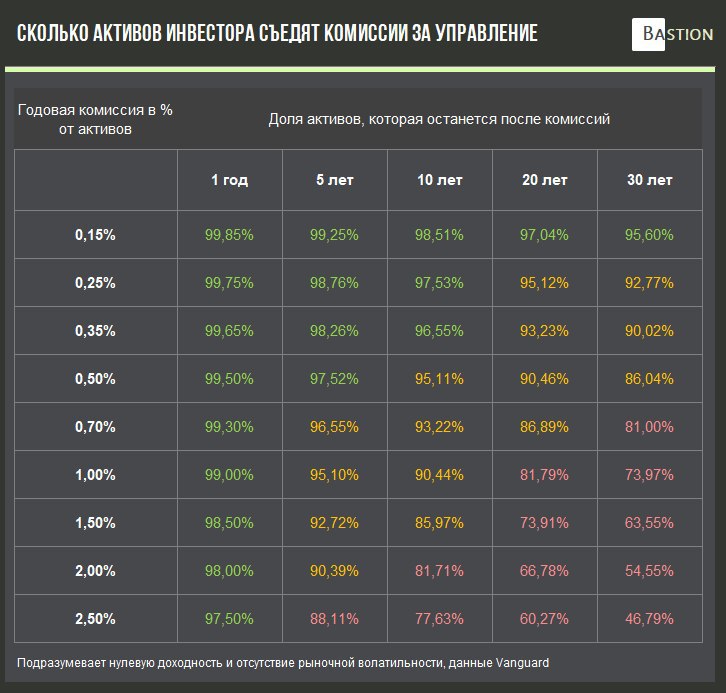 Это объясняет популярность пассивных ETF на Западе, где комиссия за управление по некоторым фондам составляет 0%. Комиссия в 2,5% на горизонте в 30 лет "съест" больше половины от первоначально инвестированных средств.