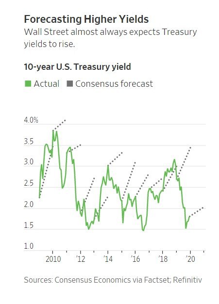 На графике история консенсус-прогнозов по 10-летним гособлигациям в США. Почему-то аналитики всегда ждут роста ставок. Раз в 5 лет это даже совпадает с реальностью.