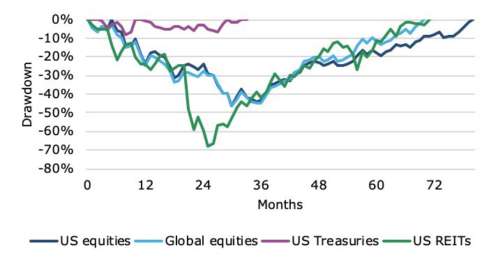 На графике показано, сколько максимум времени главные классы активов в США с 1970 года проводили "под водой", то есть не могли превысить предыдущий максимум.