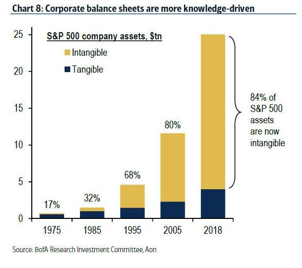 Нужно отметить, что показатель, судя по всему, получен не из бухгалтерского баланса, а из рыночной оценки нематериальных активов авторами исследования. Если посмотреть реальные балансы в отчетах Apple, Microsoft, Google, Amazon, Facebook, доля нематериальных активов едва будет дотягивать до 15%.