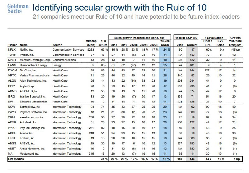 Еще один график от инвестбанка с акциями роста. "Правило 10" означает, что выручка компании росла минимум на 10% в год последние два года и будет расти не менее 10% в год в течение двух следующих лет. Сейчас таких акций на рынке 21. Ожидаемо, что стоят они очень дорого. Медианный P/E - 44x.