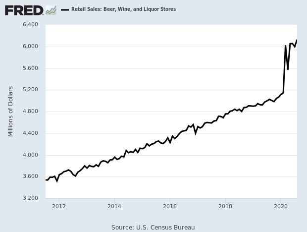 Когда видишь этот график инстинктивно хочется поискать ETF на производителей алкоголя (такого вроде нет). Но торопиться не стоит. Скорее всего, если сюда наложить потребление алкоголя в барах и продажи в дьюти-фри, то мы просто зафиксируем миграцию потребителя из общественных мест в собственные дома и квартиры.