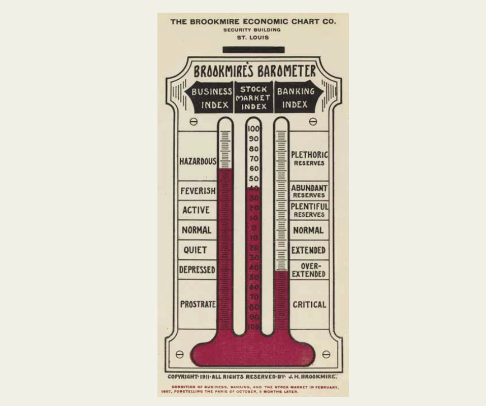 📊Начало 20 века стало бумом фирм, занимавшихся прогнозированием рынка акций. Для инвесторов была придумана ставшая популярной инфографика с "барометрами настроений". На картинке изображен такой барометр из журнала экономических графиков Брукмаера 1913 года. Настроения поделены на корпоративный и банковский сектора, а также на рынок в целом.