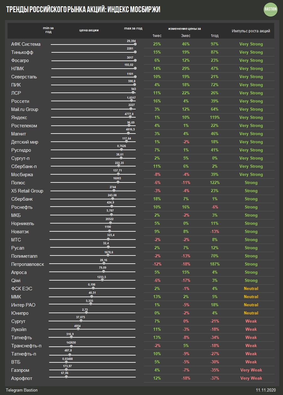 Таблица показывает, где находится текущая цена акций индекса Мосбиржи относительно минимума и максимума за год. Чем ближе ползунок вправо, тем выше текущий интерес к акции на рынке.