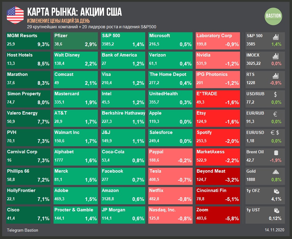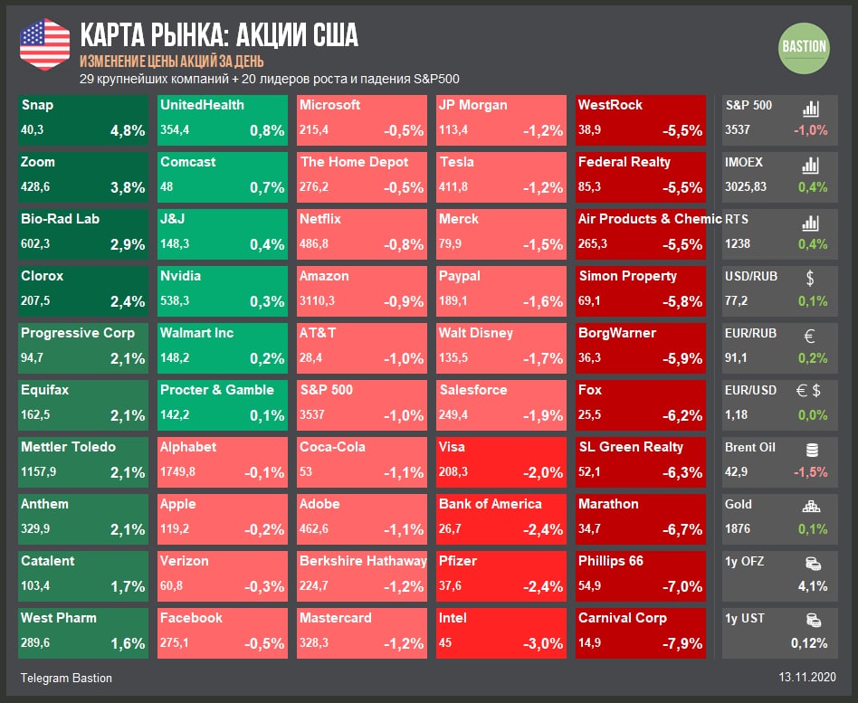 ▫️Эйфория на новостях об "эффективной вакцине" прошла. Индекс S&P500 возвращается к уровню открытия недели, нефтяники и круизные компании вновь в лидерах падения.