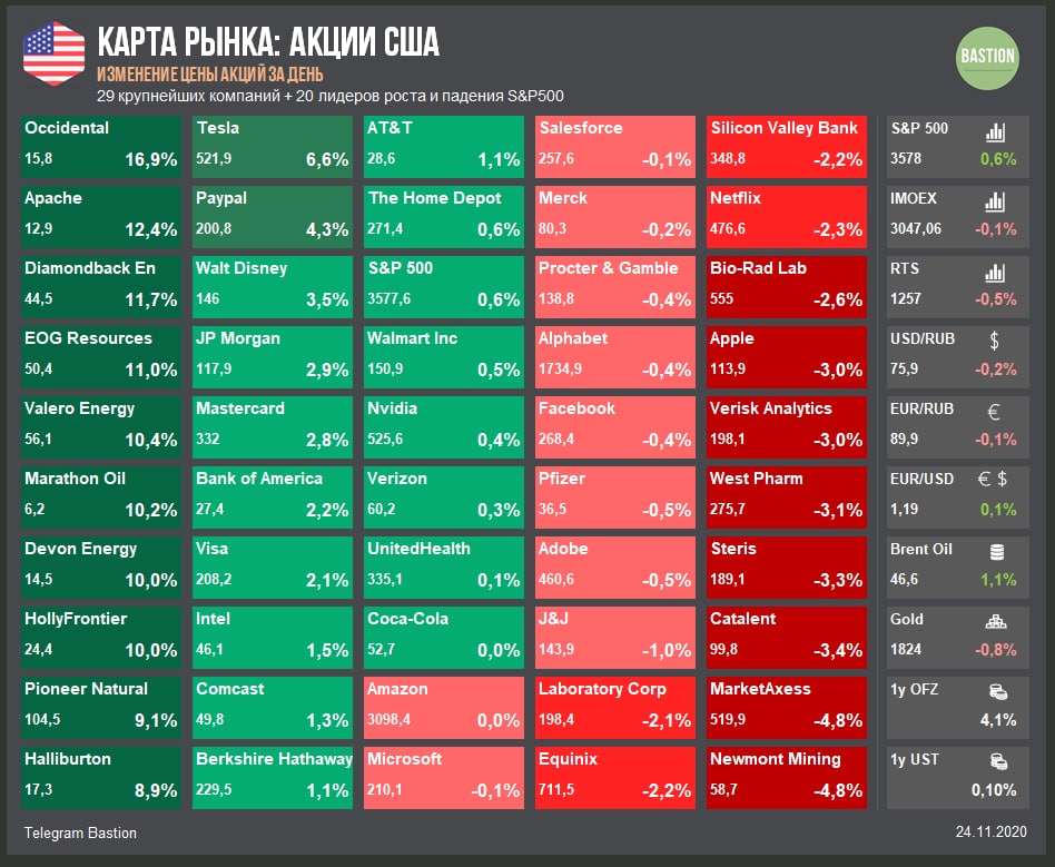 ▫️На положительных новостях о вакцине продолжает рост американский нефтегазовый сектор. Occidental, Apache, Diamondback в лидерах роста.