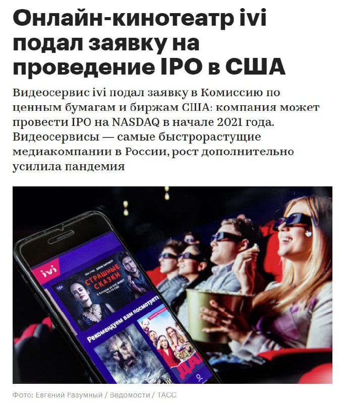 ▫️Видеосервис ivi подал заявку в Комиссию по ценным бумагам и биржам США: компания может провести IPO на NASDAQ в начале 2021 года, сообщает РБК.