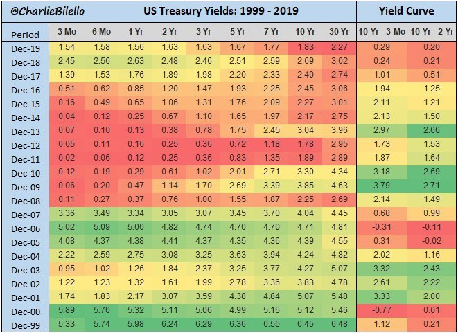 Финансовые СМИ соревнуются как показать суперрезультаты финансовых рынков в 2019 году. WSJ зелеными квадратиками отмечает годы, когда акции США, золото и нефть росли >10%, а синими - когда ставки по 10-летним гособлигациям падали >0,75%.