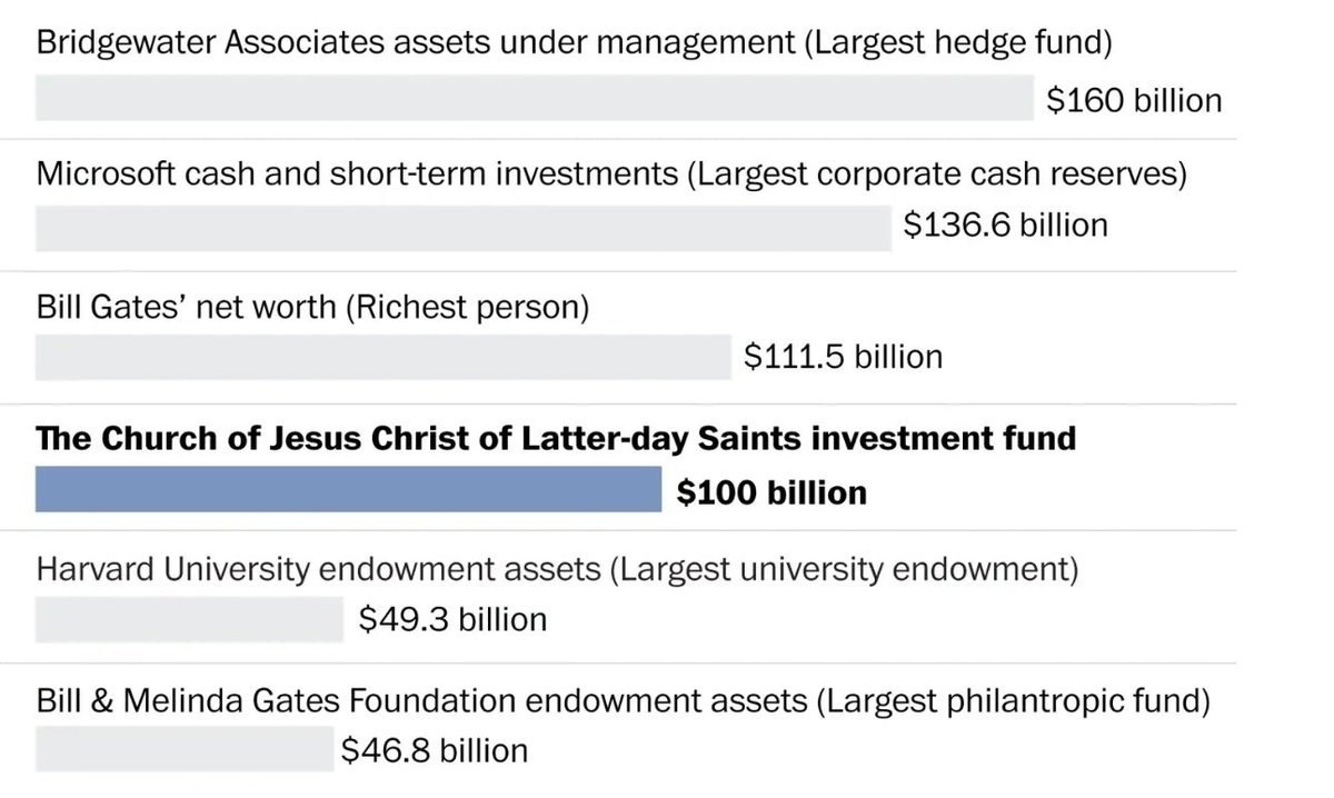 Мормонская церковь собирает в год $7 млрд пожертвований. Портфель в $100 млрд ставит мормонскую церковь в одну категорию с крупнейшими хедж-фондами и эндаументами.