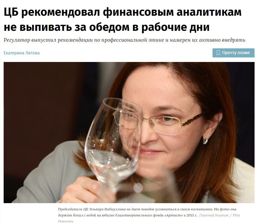 Для наглядности в этическом кодексе, который перевел ЦБ с материалов CFA Institute, рассматриваются конкретные примеры возможных нарушений. Так, нарушением «стандарта профессионализма» является распитие алкоголя в послеобеденное время.