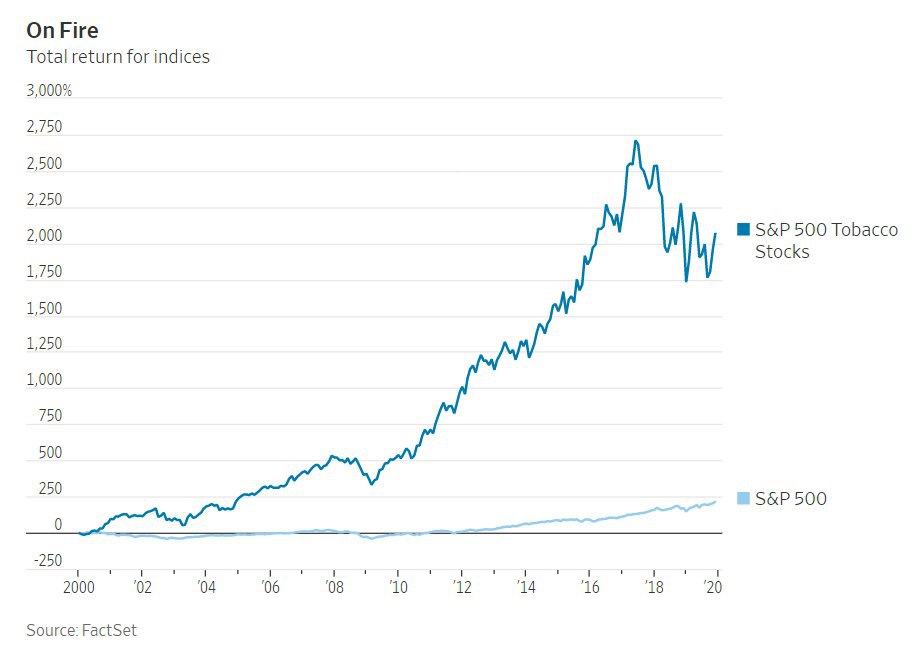 "Библейские ETF" исключают из своего состава компании по производству сигарет, что исторически крайне невыгодно для доходности портфеля. Индекс акций табачных компаний США в 21 веке почти в 10 раз опередил по общей доходности индекс S&P500.