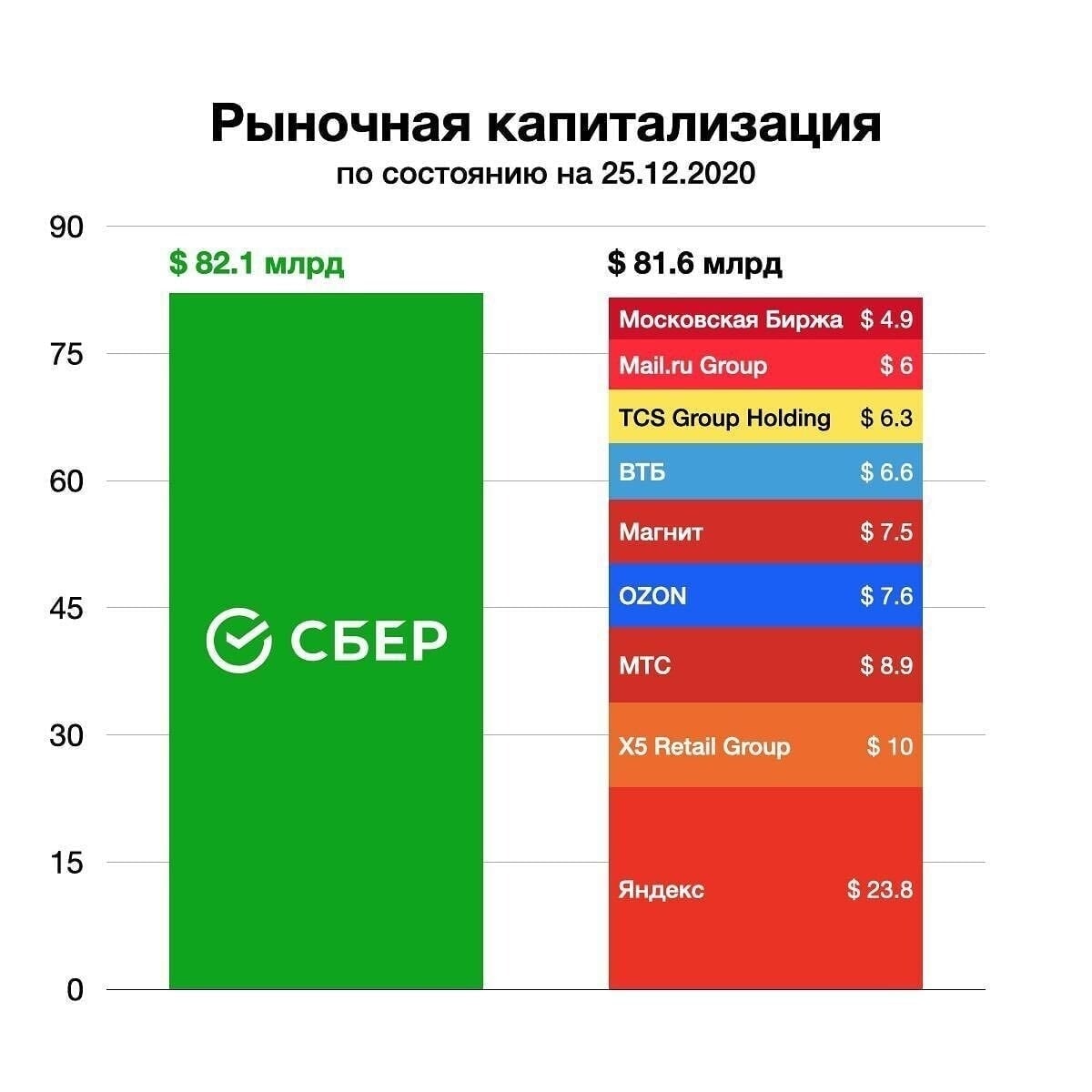 Капитализация Сбербанка в сравнении c крупнейшими компаниями из ИТ и ритейла в России. Картинка от руководителя SberDevices, видимо, чтобы сравнить масштаб. Если бы у вас было $82 млрд, вы бы предпочли купить Сбер 🟢 или всех отсальных🔴?