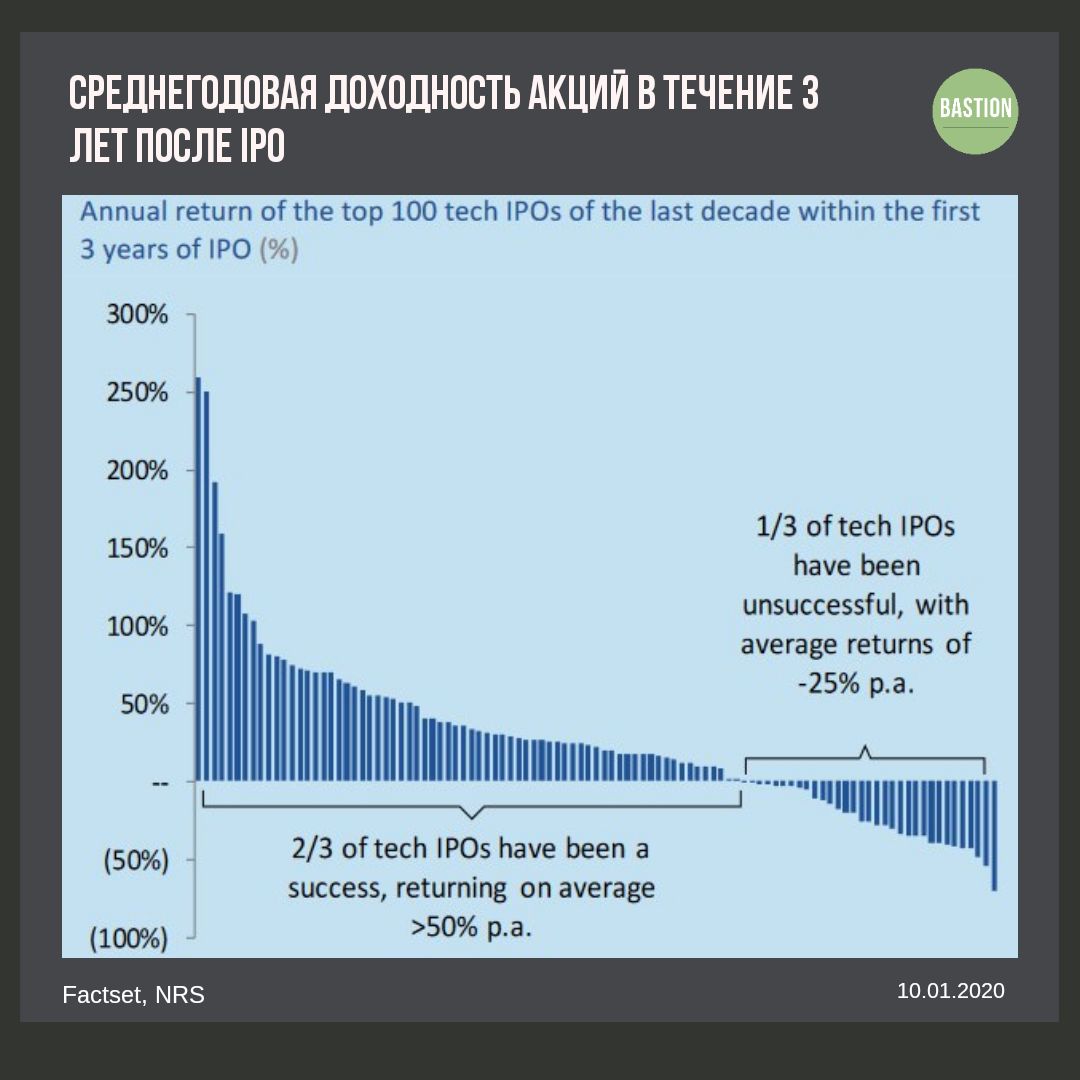 Проедшее десятилетие оказалось успешным для инвесторов на первичном рынке. 2/3 акций в США показало прибыль после IPO со среднегодовой доходностью >50% в течение 3 лет.