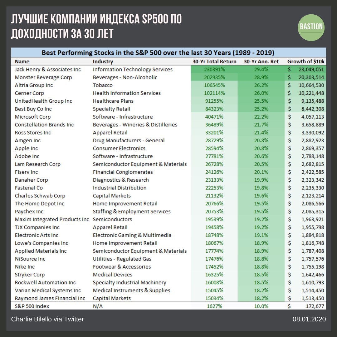 Лучшие компании по доходности за 30 лет из текущего состава индекса S&P500
