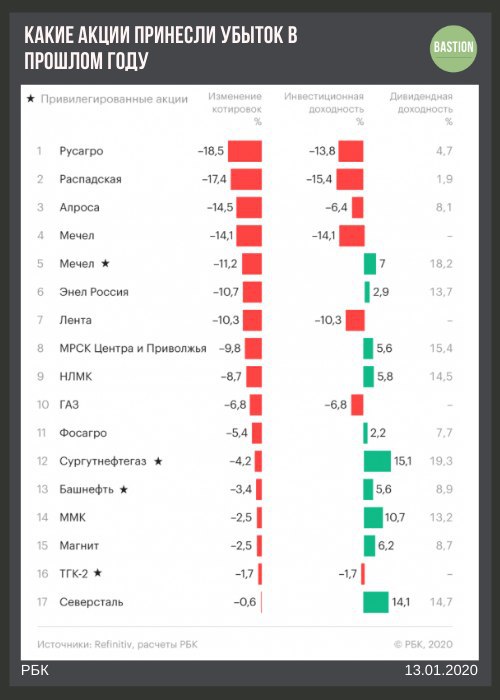 В прошлом году российский рынок с учетом дивидендов прибавил почти 40%. Однако недиверсифицированные портфели из небольшого количества бумаг вполне могли получить убыток, если содержали компании из списка ниже.