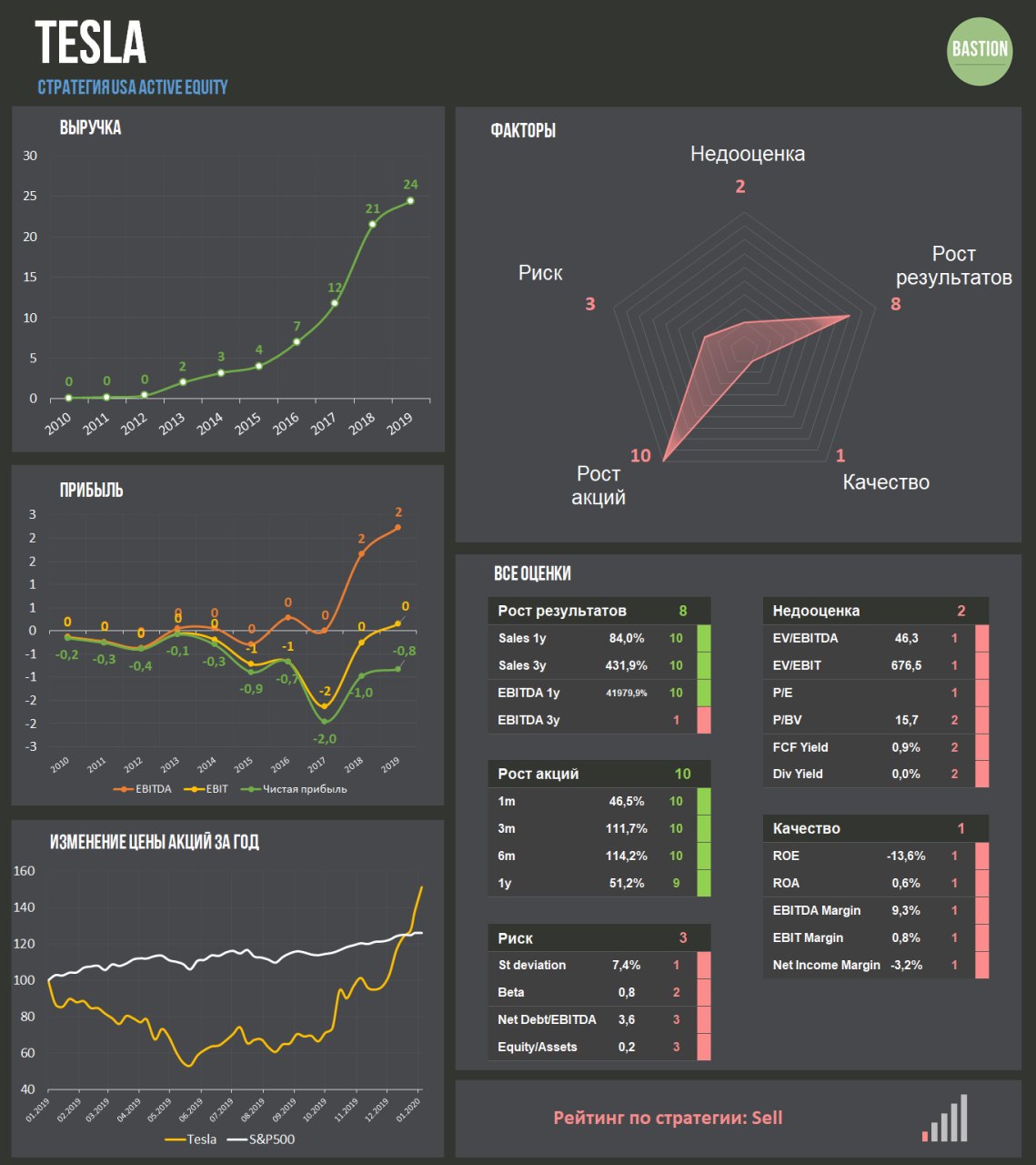 Настоящее безумие продолжается в акциях Tesla. Убыточная компания с высокой долговой нагрузкой оценивается по сумасшедшим мультипликаторам. Рост акций компании за 3 месяца превысил 100%. Кто-то очень верит в рост будущих результатов.