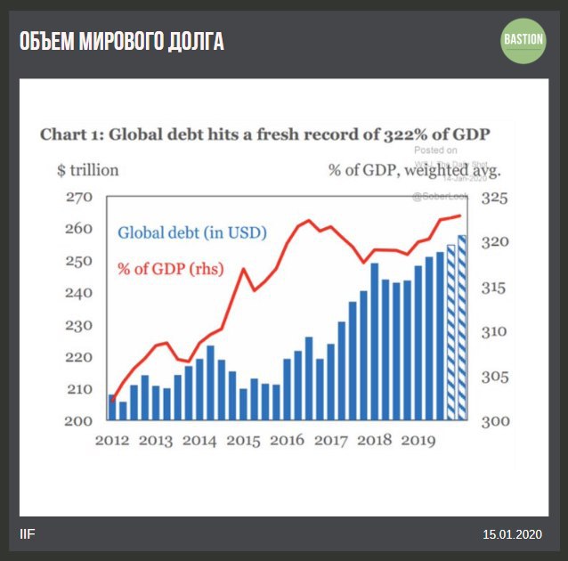 ▫️В 3 квартале 2019 года суммарная долговая нагрузка домохозяйств, правительств, корпораций в мире выросла до рекордно высоких 322% глобального ВВП.