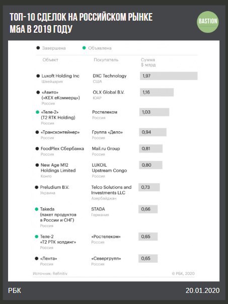 Прошедший 2019 год стал наихудшим для российского рынка слияний и поглощений за 17 лет - Refinitiv.