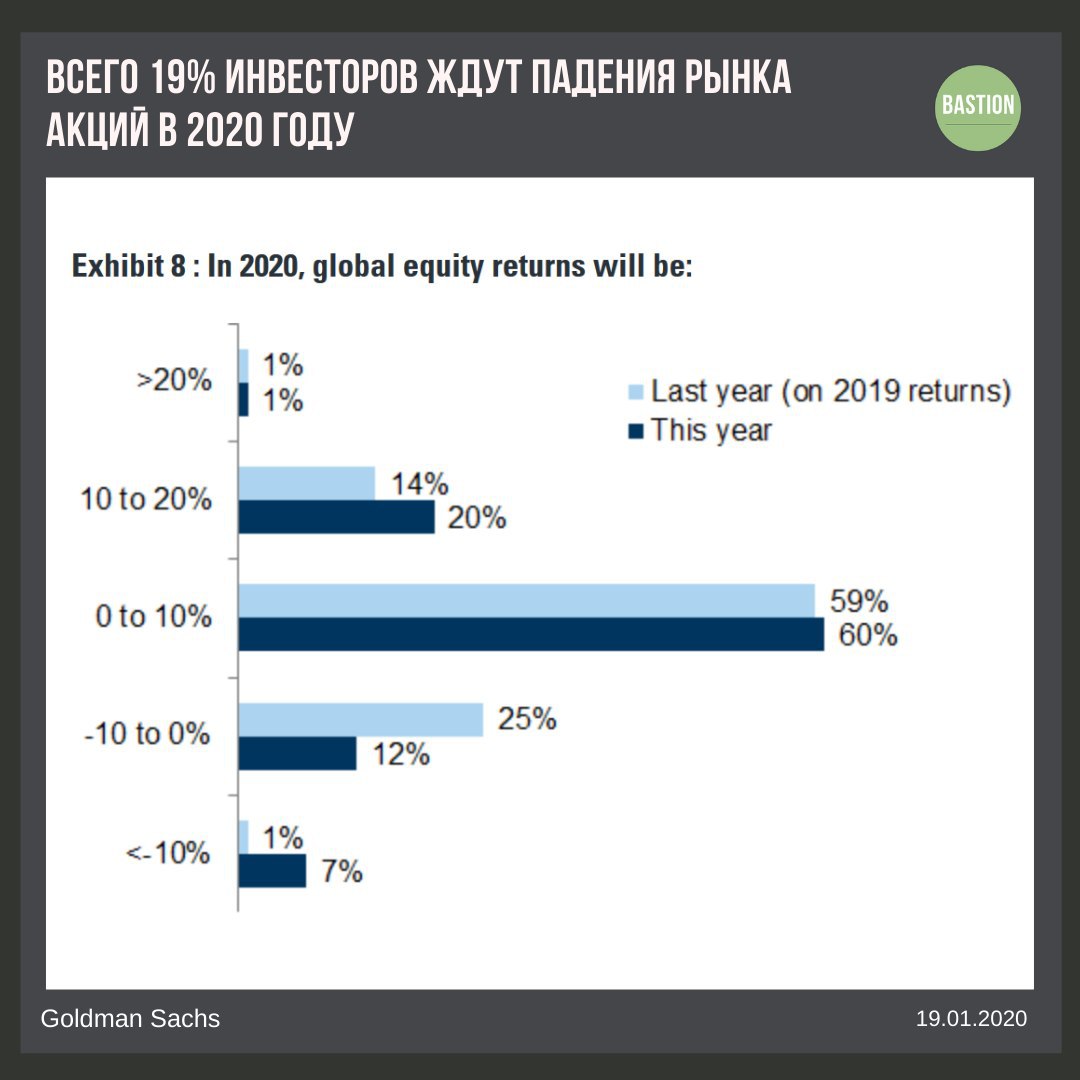 После мощного начала года инвесторам сложно поверить, что рынки могут упасть. Всего 19% опрошенных на конференции Goldman Sachs ждут снижения мирового индекса акций в 2020 году.