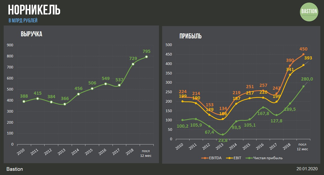 Стоимость палладия на прошлой неделе побила очередной исторический рекорд, поднявшись до $2,3 тыс. за тройскую унцию. При высоких ценах на металл EBITDA Норникеля может достичь рекордных 550 млрд рублей по итогам 2019 года. На компанию приходится до 40% мирового производства палладия.