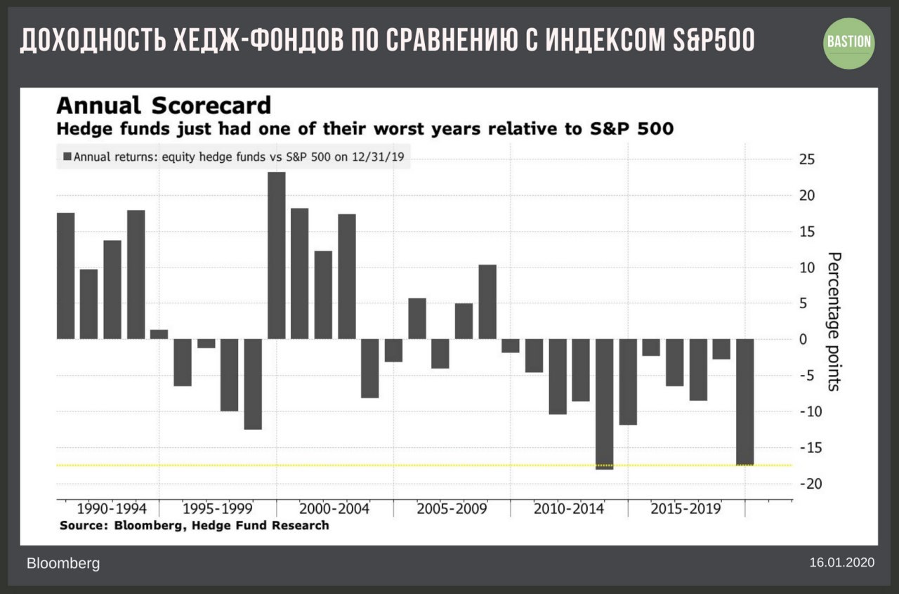 В реальном мире доходность хедж-фондов ужасающая. На графике показана разность в доходности по годам между индексом хедж-фондов и индексом S&P500. 11 лет подряд хедж-фонды проигрывают рынку акций.