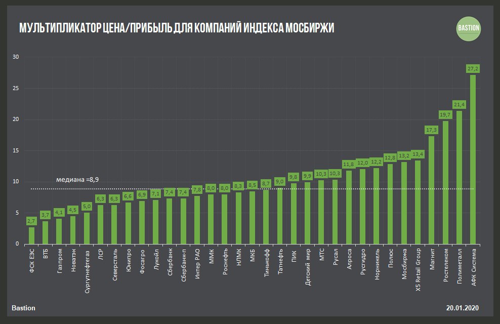 📊 Текущие значения мультипликатора Цена/Прибыль за последние 12 месяцев для компаний индекса Мосбиржи.