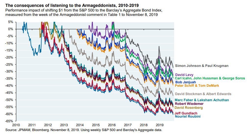 Прогнозами о том, что вот-вот наступит кризис и пора продавать акции страдают не только российские комментаторы. JP Morgan подсчитал, сколько бы за последнее десятилетие потеряли бы инвесторы, если бы слушались "вестников Армагеддона" - уважаемых аналитиков и экономистов, пытавшихся угадать момент начала кризиса.