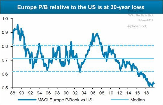 Популярной идеей у Value инвесторов становится ставка на рост европейских акций: недооценка MSCI Europe по мультипликаторам относительно акций США максимальная в новейшей истории наблюдений.