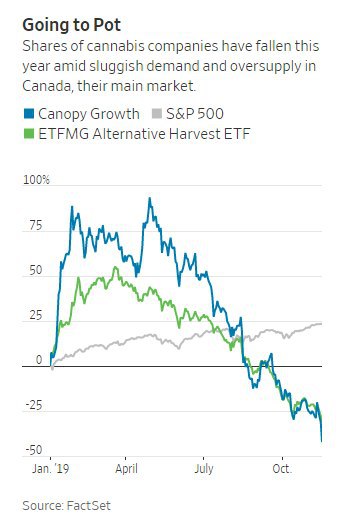 ETF-фонд на производителей конопли "ETFMG Alternative Harvest" в начале года на 40% опережал индекс S&P500,однако к середине ноября его отставание по доходности стало катастрофическим.