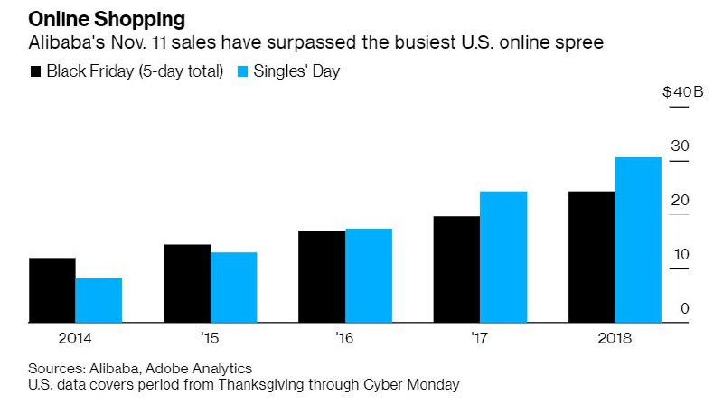 Ежегодно 11 ноября китайский интернет-гигант Alibaba устраивает распродажу, которая называется "днем холостяков". С 2016 года событие обеспечивает выручку китайским ритейлерам, превышающую доходы американских компаний во-время "черной пятницы". В этом году Alibaba вновь побила рекорд по выручке в $млрд: