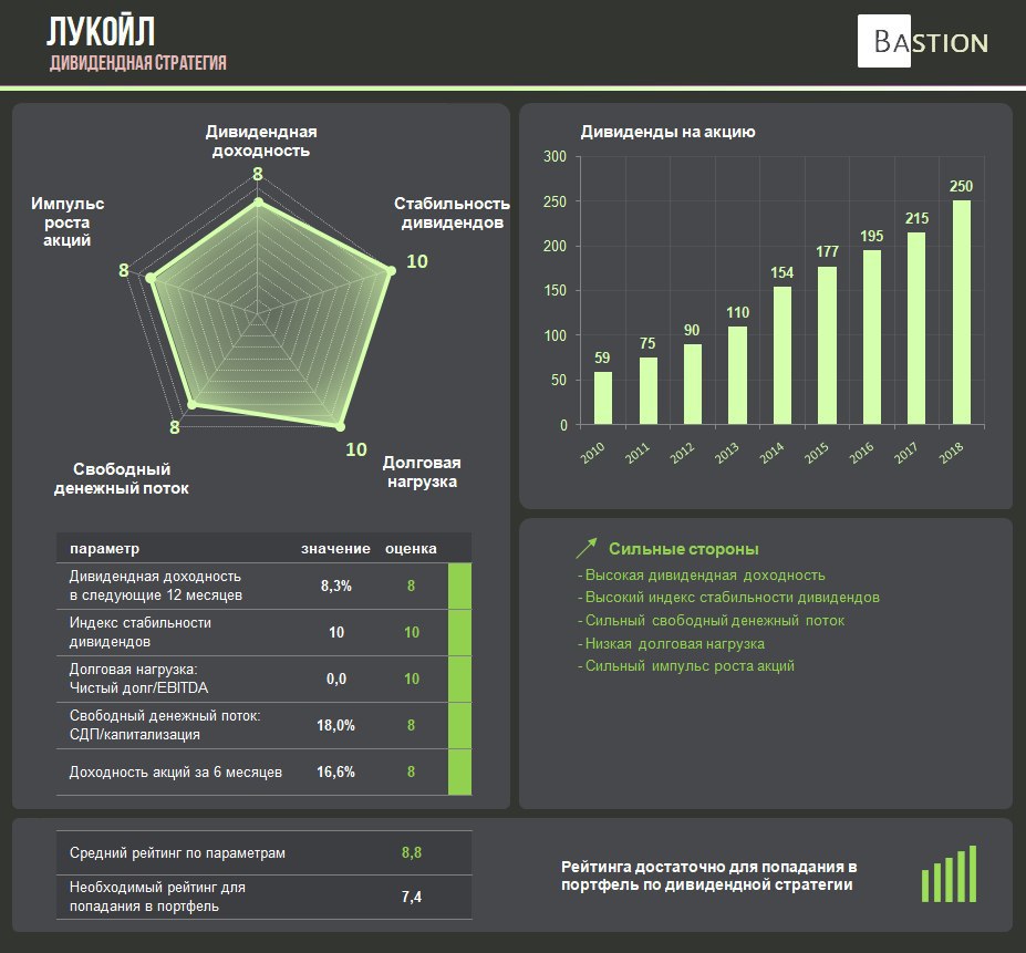 Компания имеет высокий рейтинг по стратегии благодаря максимальному индексу стабильности дивидендов и низкой долговой нагрузке. Татнефть планирует увеличить инвестиции в ближайший год, однако обещает поддерживать уровень выплат акционерам не ниже предыдущих лет.